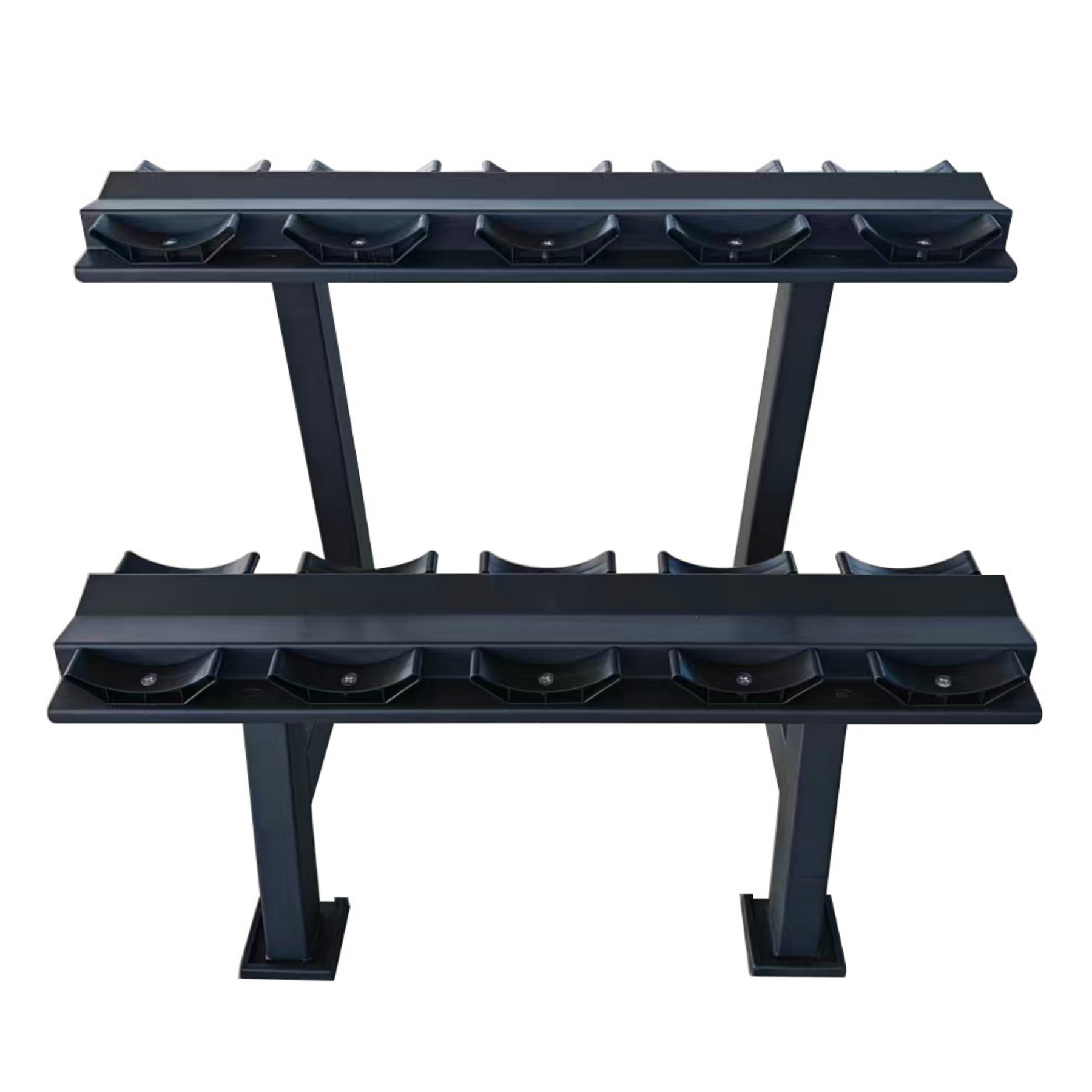 Each cradle is formed with a contoured seat and integrated safety lip that secures round-head dumbbells and prevents rolling or handle abrasion. The dual-tier layout is angled for ergonomic access, allowing smooth racking and retrieval with reduced wrist strain during repetitive cycles. Cradle spacing is calibrated to accommodate a range of dumbbell diameters while maintaining clearance for quick transitions between sets.