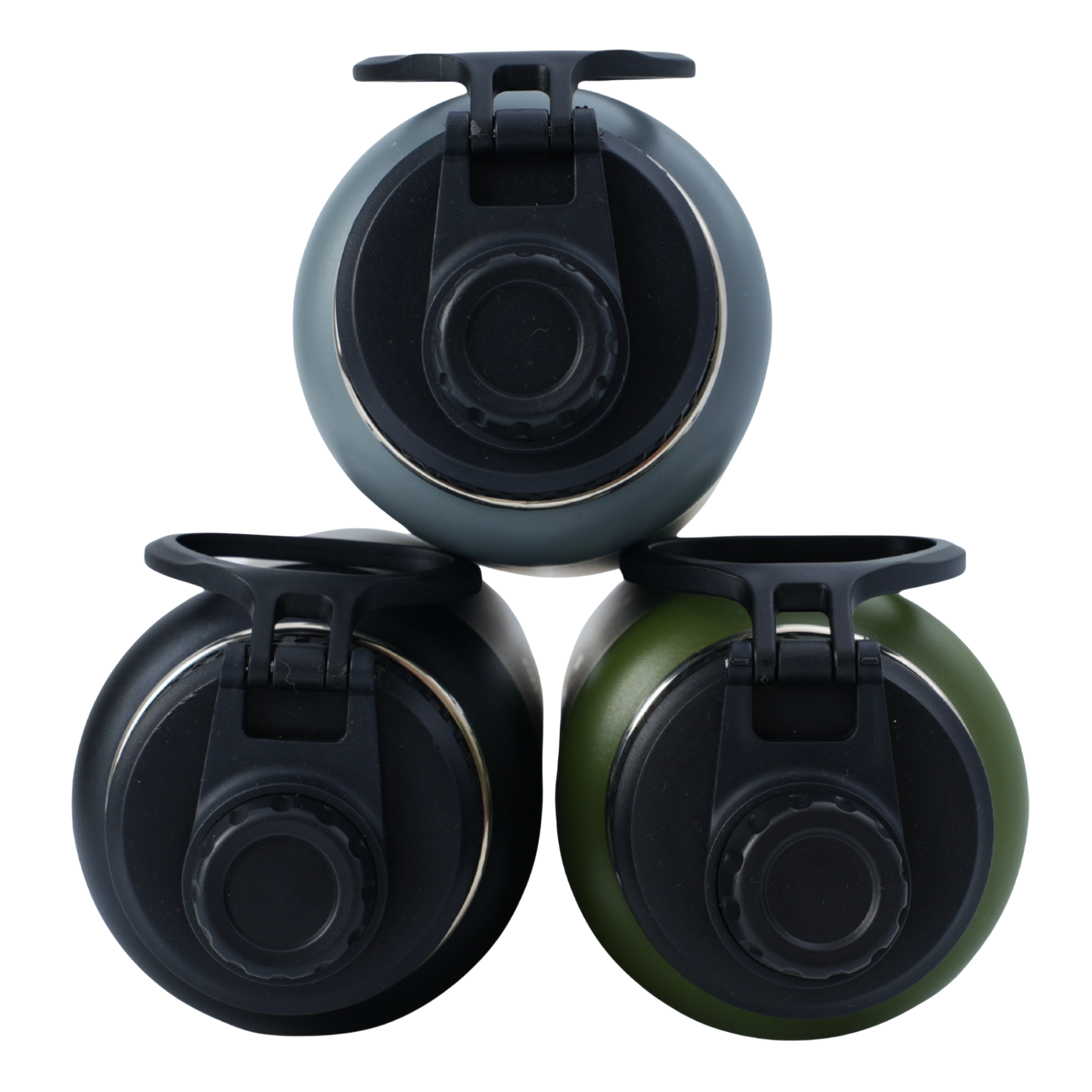 Available in three tactical finishes: Black, Grey, and Olive Green, this bottle combines rugged performance with versatile training function.