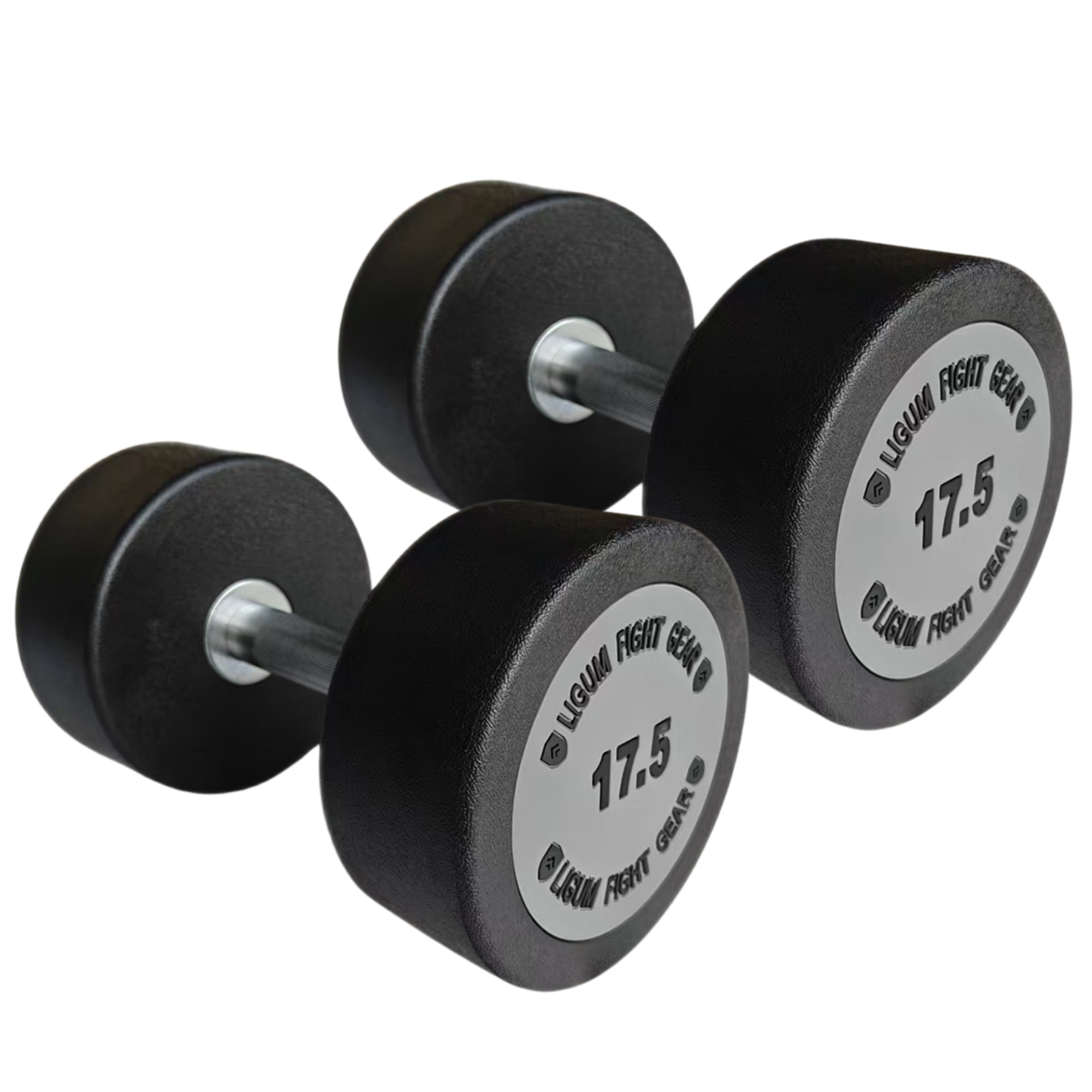 Every dumbbell in this series features dual-sided embossed branding on the endplates, ensuring Ligum Fight Gear’s premium identity is always visible on the gym floor. The flat-faced round head design reduces rolling and makes racking clean and efficient, while the textured urethane finish resists scuffs and maintains a like-new appearance even after years of use. Large, recessed weight numbers improve visibility for quick selection in high-traffic environments, and the fully-machined chrome handle offers a confident grip for serious training intensity.