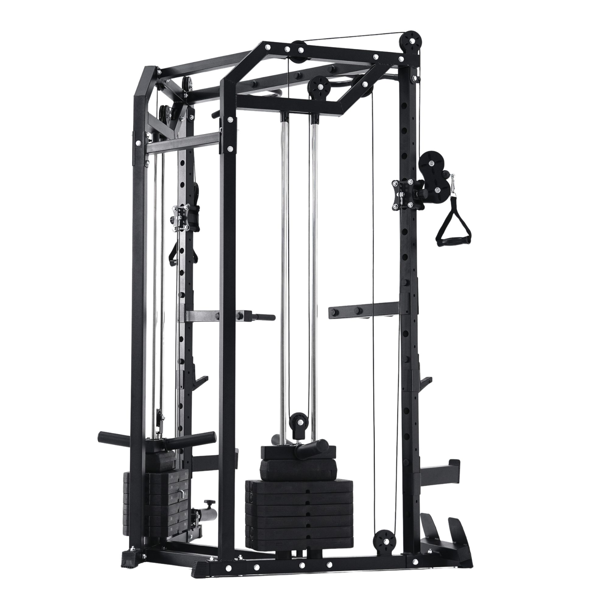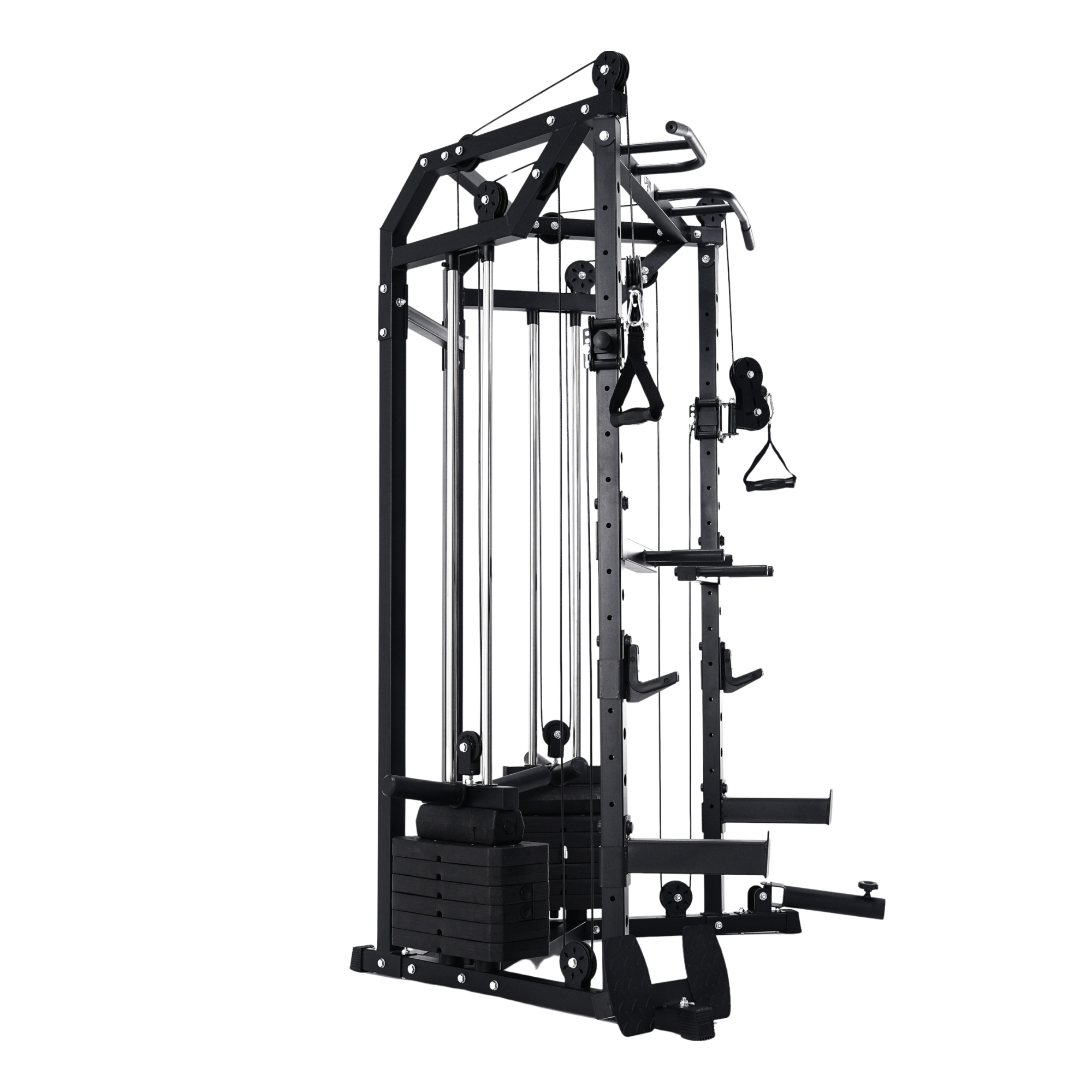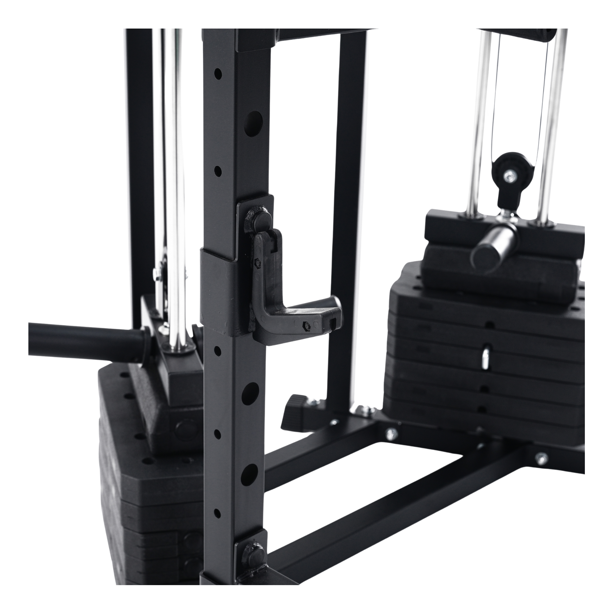The machine’s pulley arms rotate laterally through 180 degrees and adjust vertically via a multi-position steel guide track, locking securely with millimetre accuracy. Each pulley runs on sealed stainless steel bearings, ensuring low-friction glide and reliable performance even under heavy, repeated use.