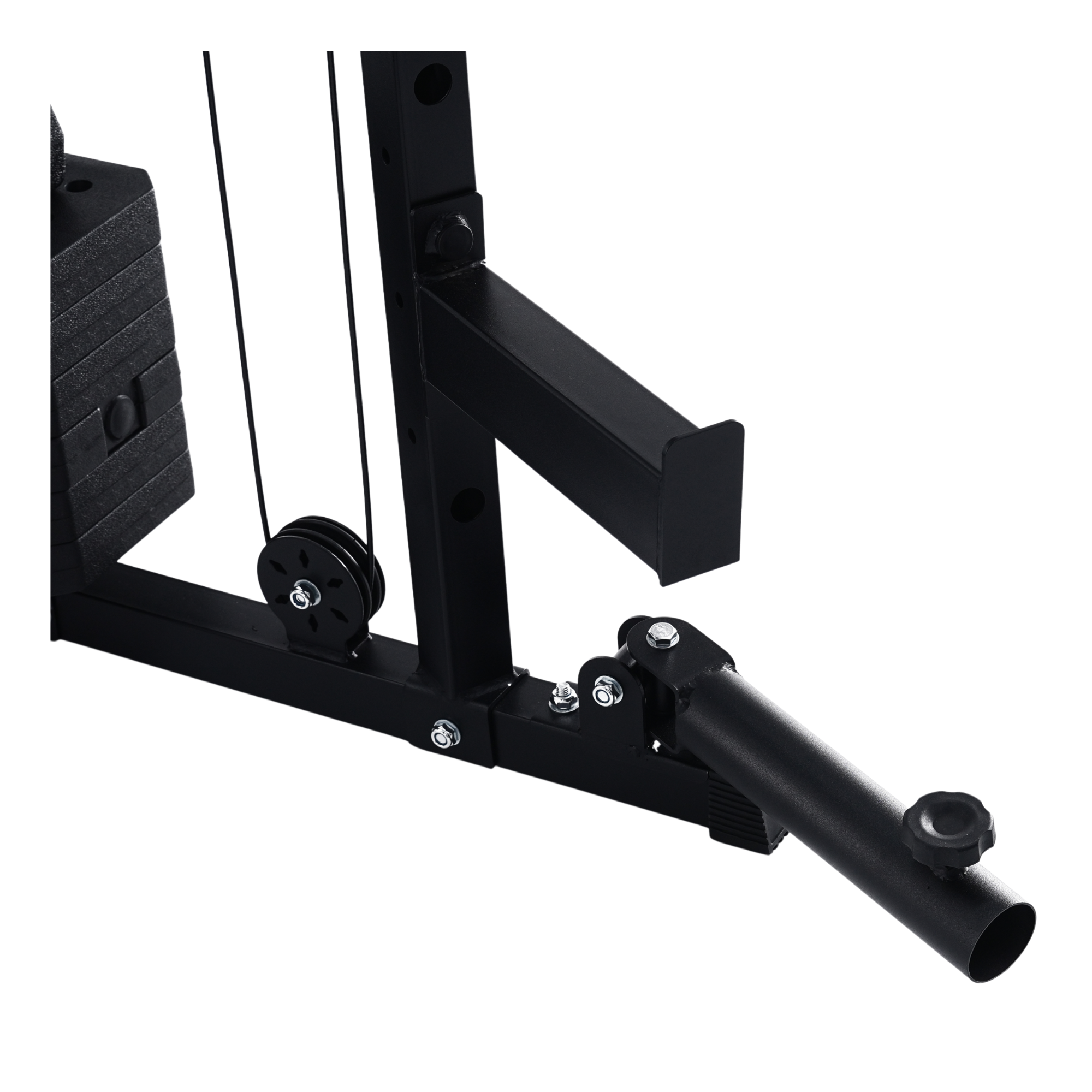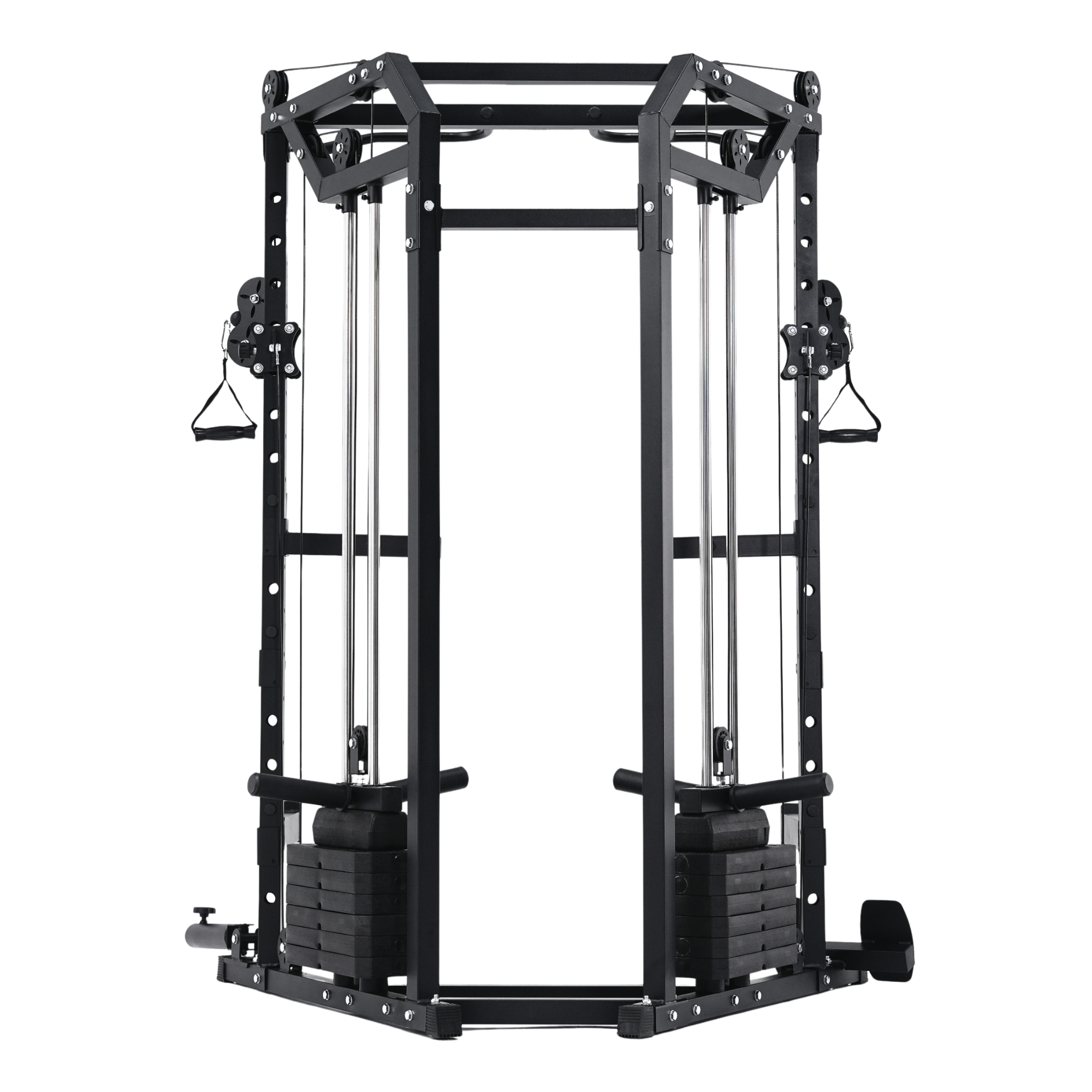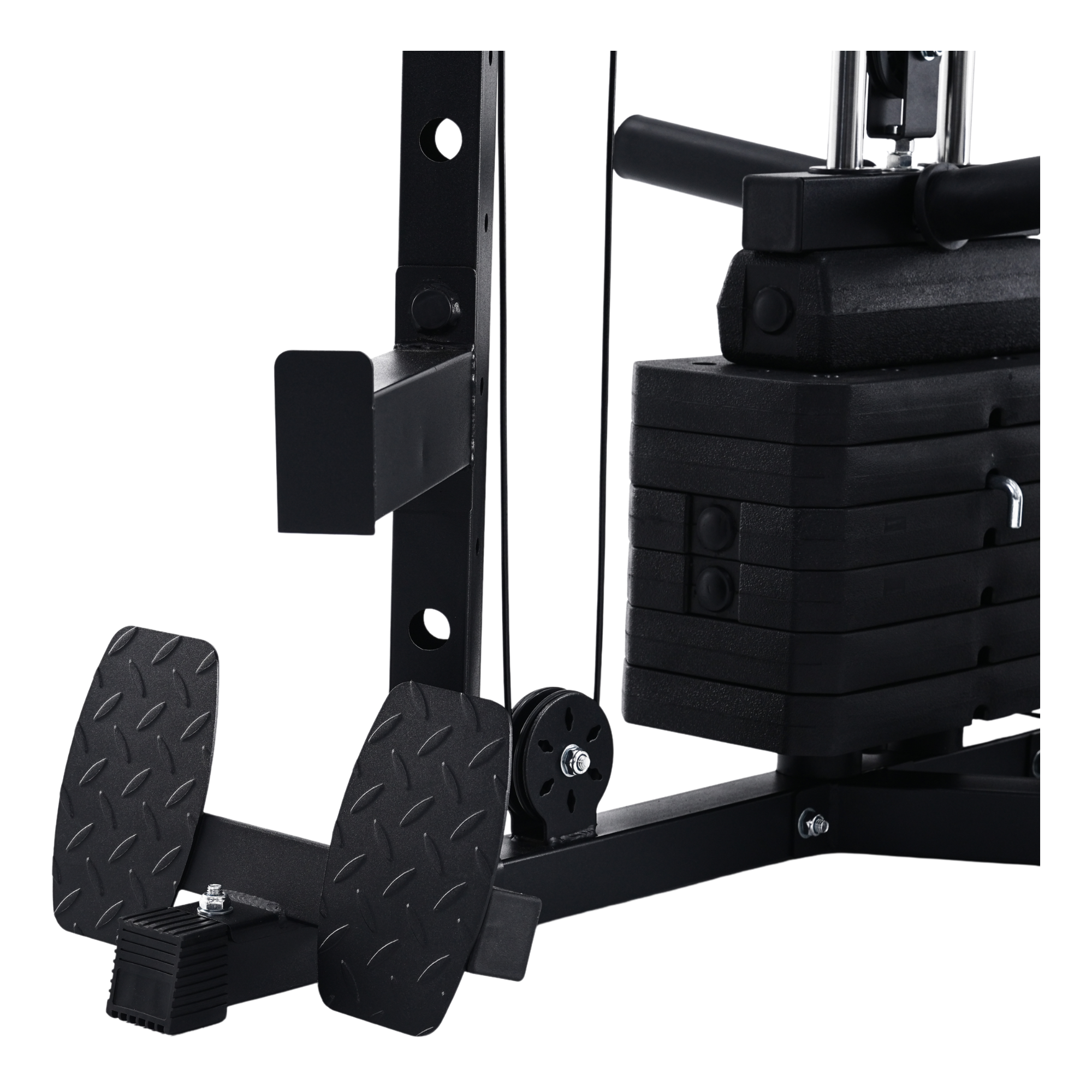The machine’s pulley arms rotate laterally through 180 degrees and adjust vertically via a multi-position steel guide track, locking securely with millimetre accuracy. Each pulley runs on sealed stainless steel bearings, ensuring low-friction glide and reliable performance even under heavy, repeated use.