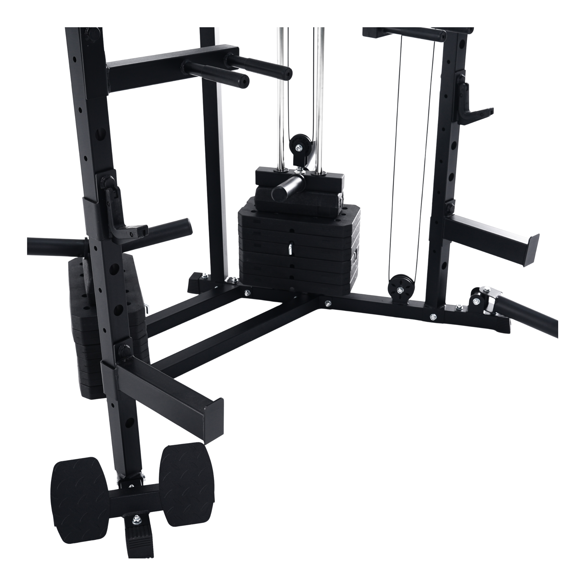 The frame is constructed from 3mm commercial-grade powder-coated structural steel, finished in matte black, and secured with M12 industrial fasteners for maximum rigidity. A welded multi-grip pull-up bar provides wide, neutral, and underhand positions, finished with a sand-textured surface for secure grip under load. Knurled angled footplates are integrated at the base to anchor the lower body during presses, pulls, and rotation work.
