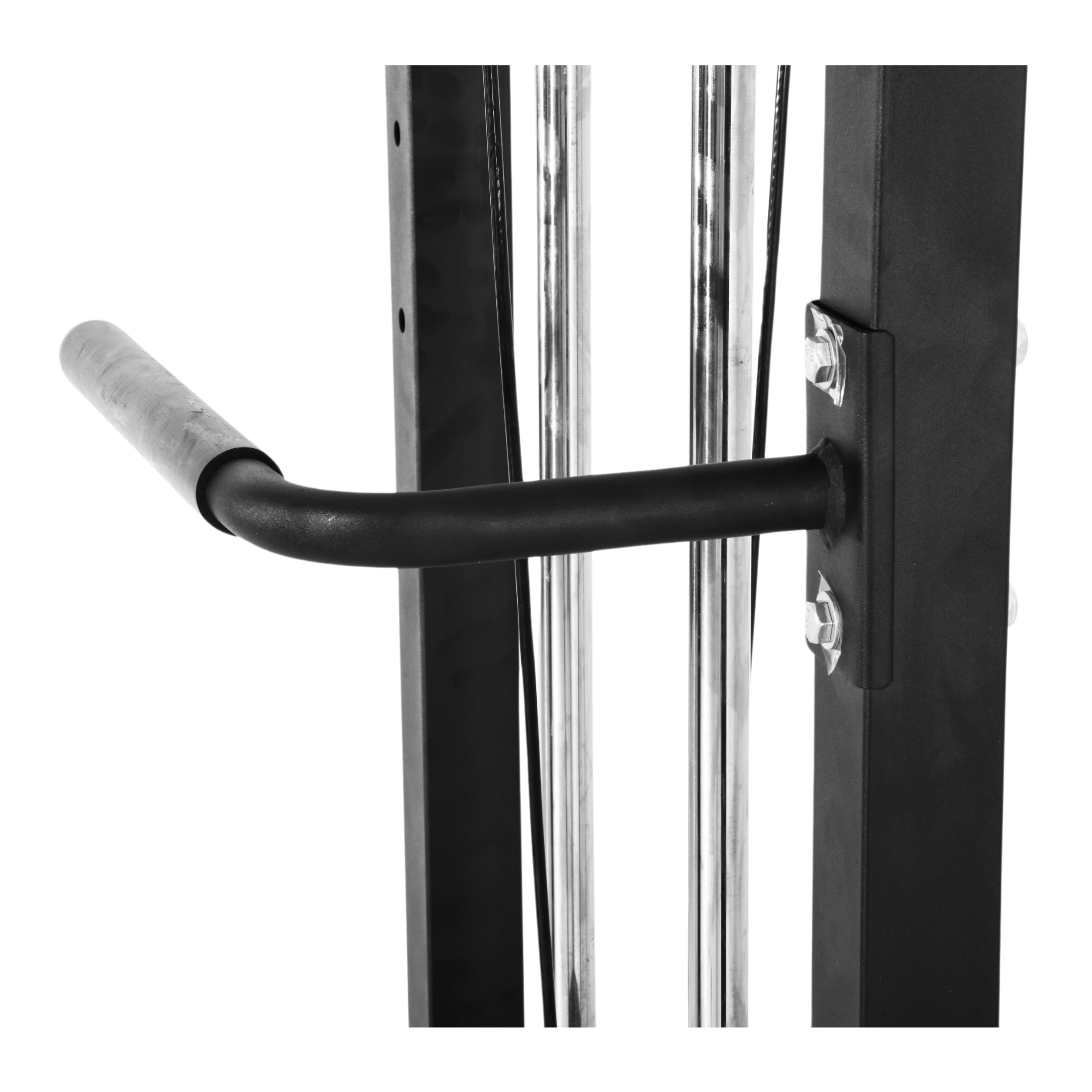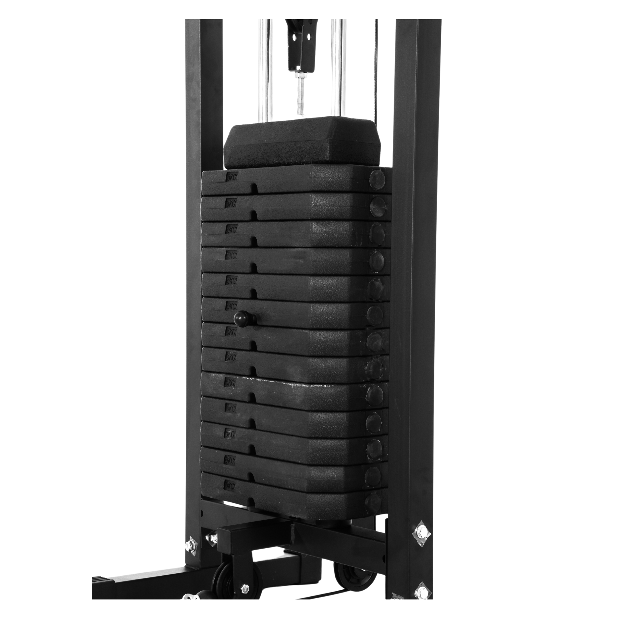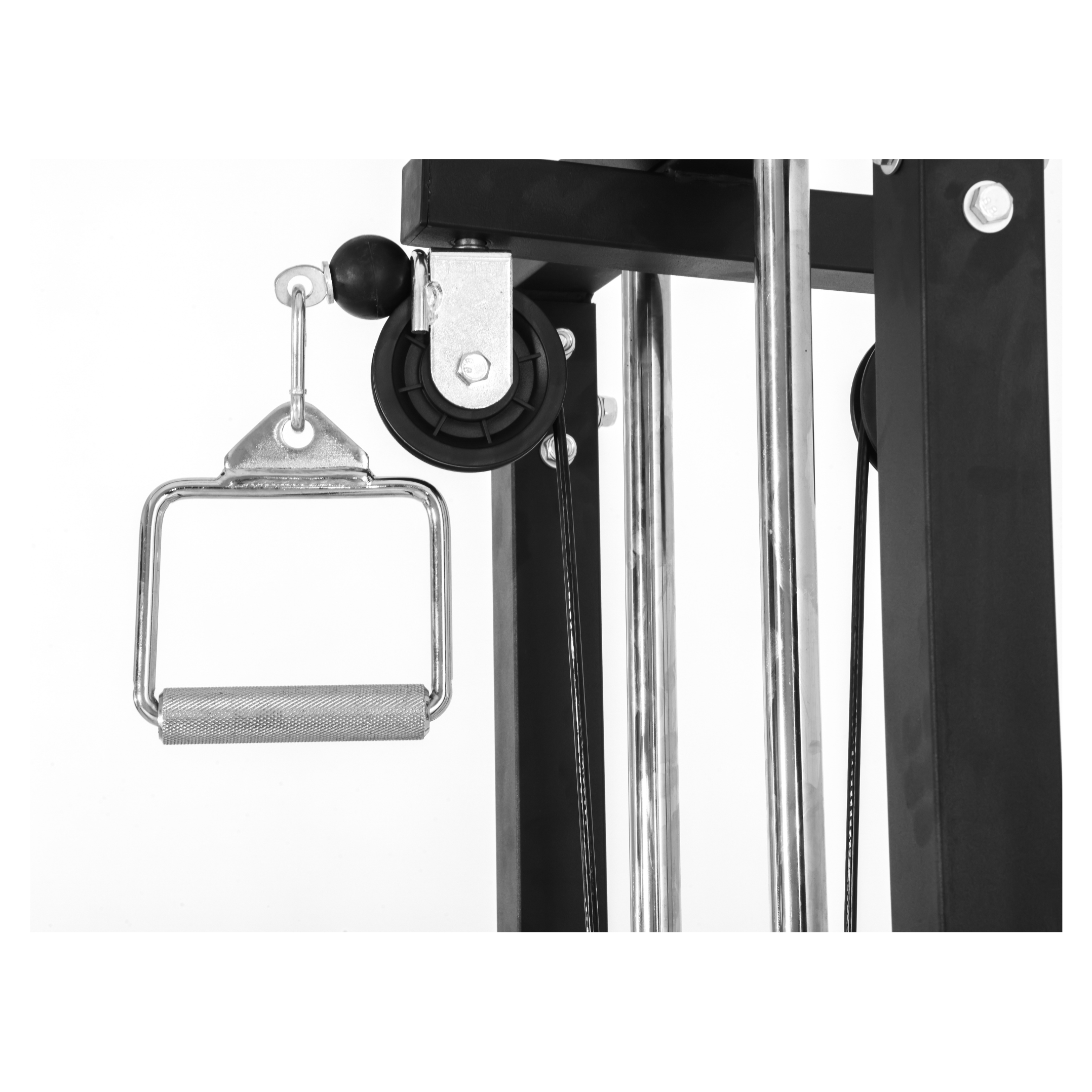 The machine includes a lat pull-up bar with multiple grip positions, rubberized handles for extended comfort, and an extra-wide base for stability. Its versatile design makes it suitable for both home and professional gyms, offering efficient strength training for athletes focused on performance. Key specifications include a durable steel frame and four cable handles with carabiner connections for easy replacement.