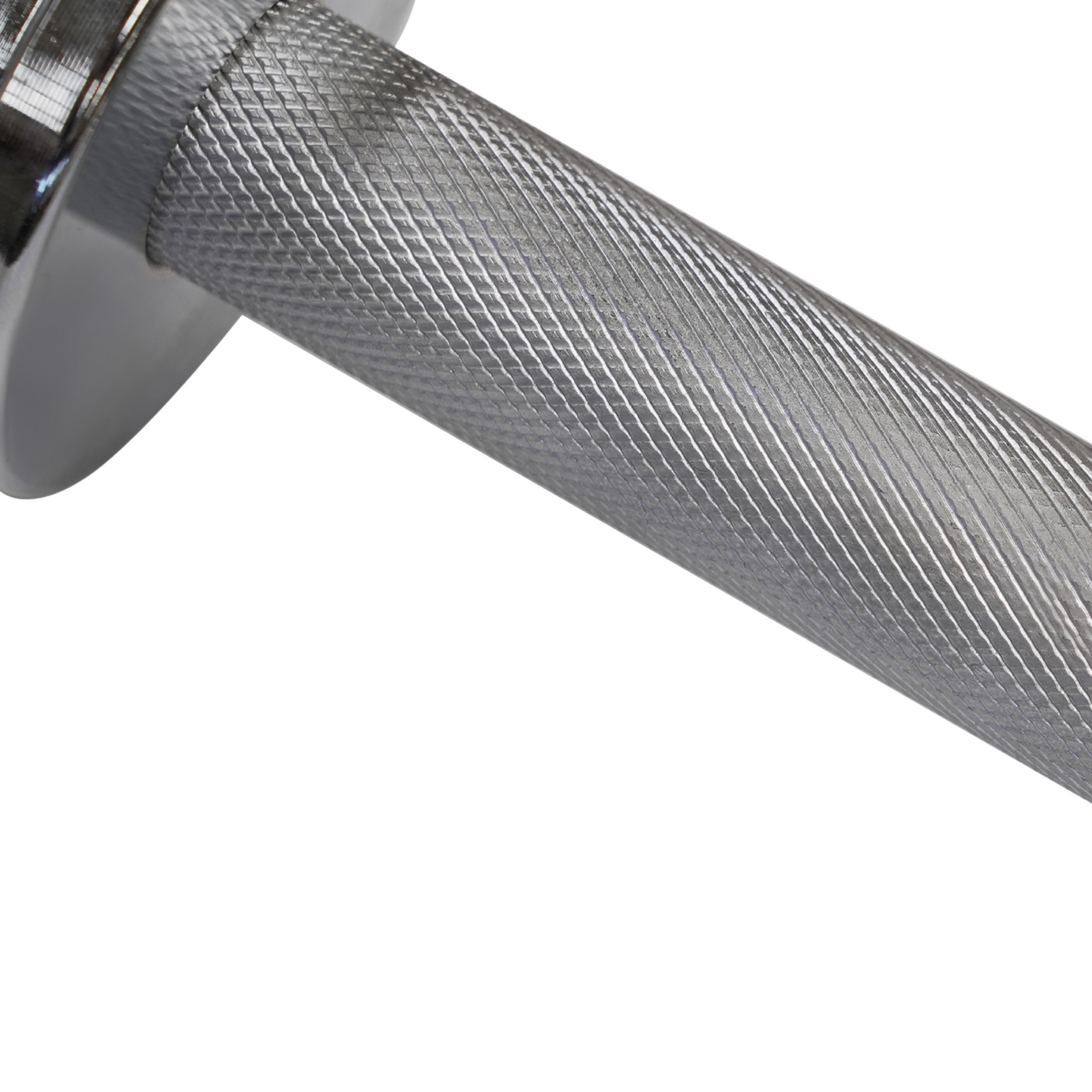 The grip zone features aggressive diamond-pattern knurling across a 10cm span, offering non-slip traction under fatigue or sweat. With a 2.54cm handle diameter and 13cm overall grip length, the bar feels stable and controlled in hand, perfect for isolation work, time-under-tension reps, or explosive lifts. These specs enhance both safety and energy transfer during curls, rows, extensions, and presses.