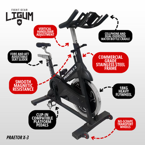 If you're serious about building a high-performance training space, the Praetor X-3 Spinning Bike from Ligum Fight Gear is more than just a cardio tool: it’s a dedicated piece of conditioning hardware engineered for power, precision, and longevity. Built to handle punishing intervals, steady-state efforts, and everything in between, the Praetor X-3 is designed for athletes who train with purpose and demand results from every session.