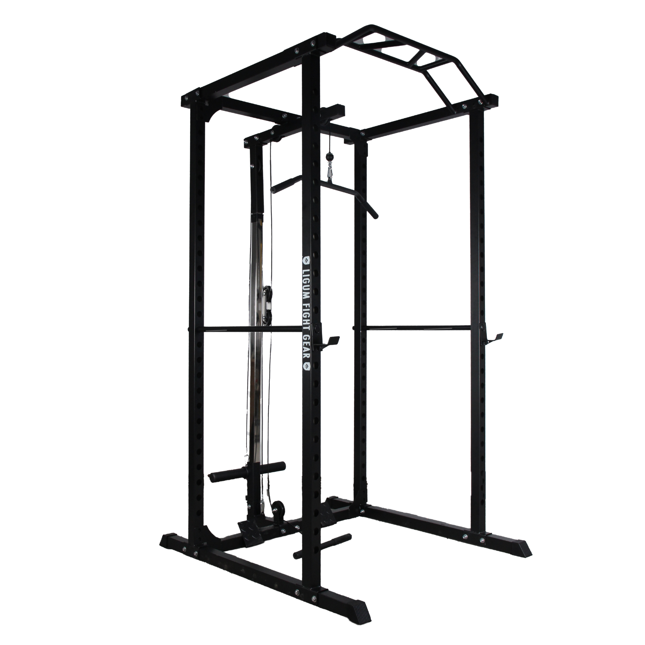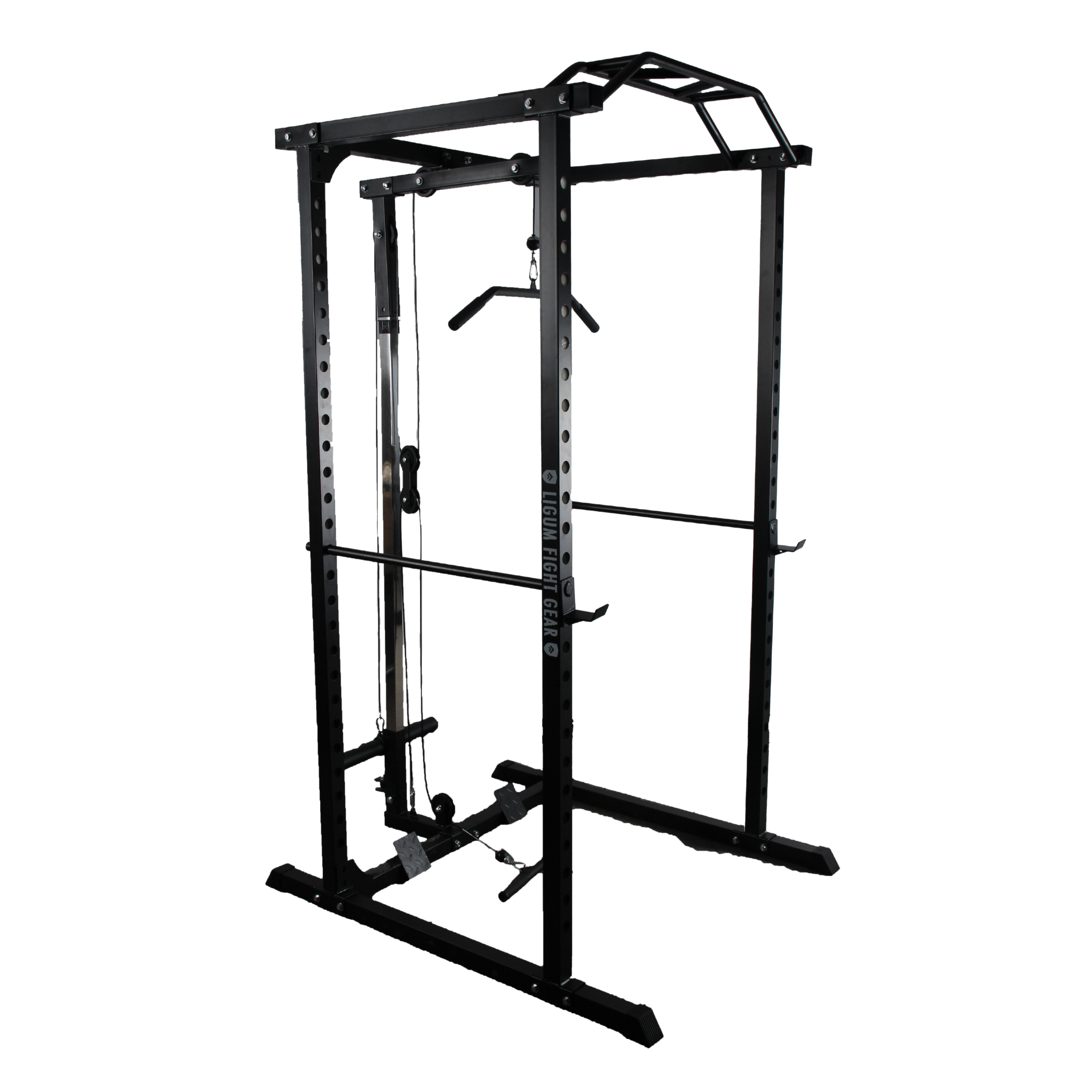 Introducing the Ligum Fight Gear Swiss Cable Power Rack – a heavy-duty, versatile rack built to elevate your strength training sessions. Constructed from high-grade steel, this squat rack is designed to handle intense workouts and support a variety of exercises, including squats, bench presses, and pull-ups. Equipped with a multi-grip pull-up bar, it allows for different hand positions to target various upper body muscles.