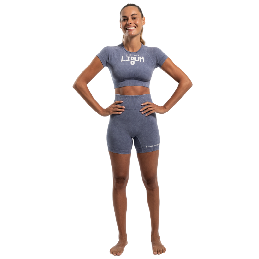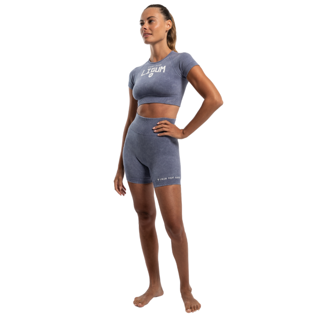 The crop top features the Ligum Fight Gear primary logo prominently placed in the center, adding a bold statement to your look, while the shorts showcase the secondary logo on the side for a subtle yet iconic touch. With its flattering tight fit and breathable material, this set provides the perfect combination of support and flexibility, making it ideal for high-intensity workouts, boxing training, or casual athleisure.