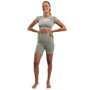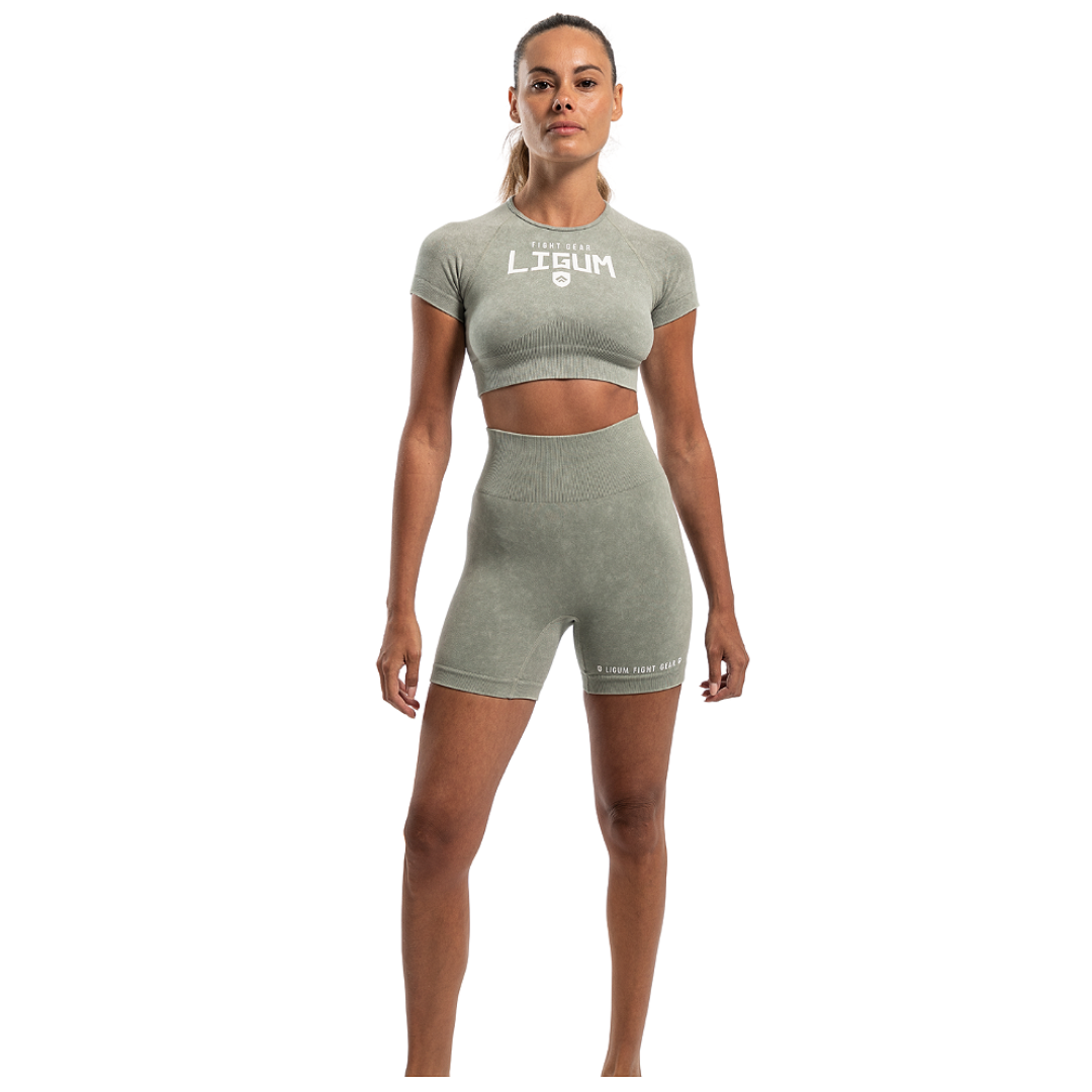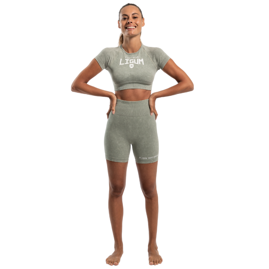 The crop top features the Ligum Fight Gear primary logo prominently placed in the center, adding a bold statement to your look, while the shorts showcase the secondary logo on the side for a subtle yet iconic touch. With its flattering tight fit and breathable material, this set provides the perfect combination of support and flexibility, making it ideal for high-intensity workouts, boxing training, or casual athleisure.